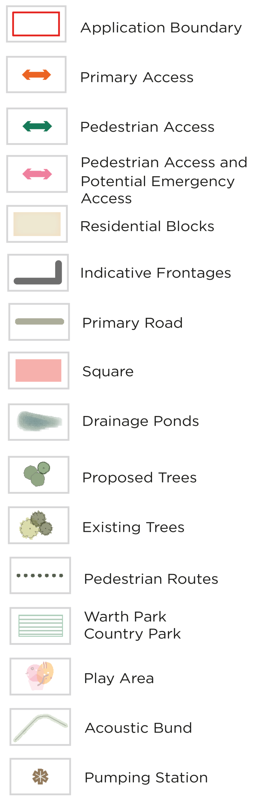 - Retention of existing mature vegetation and the creation of new green and blue infrastructure including improved connections to Warth Country Park;