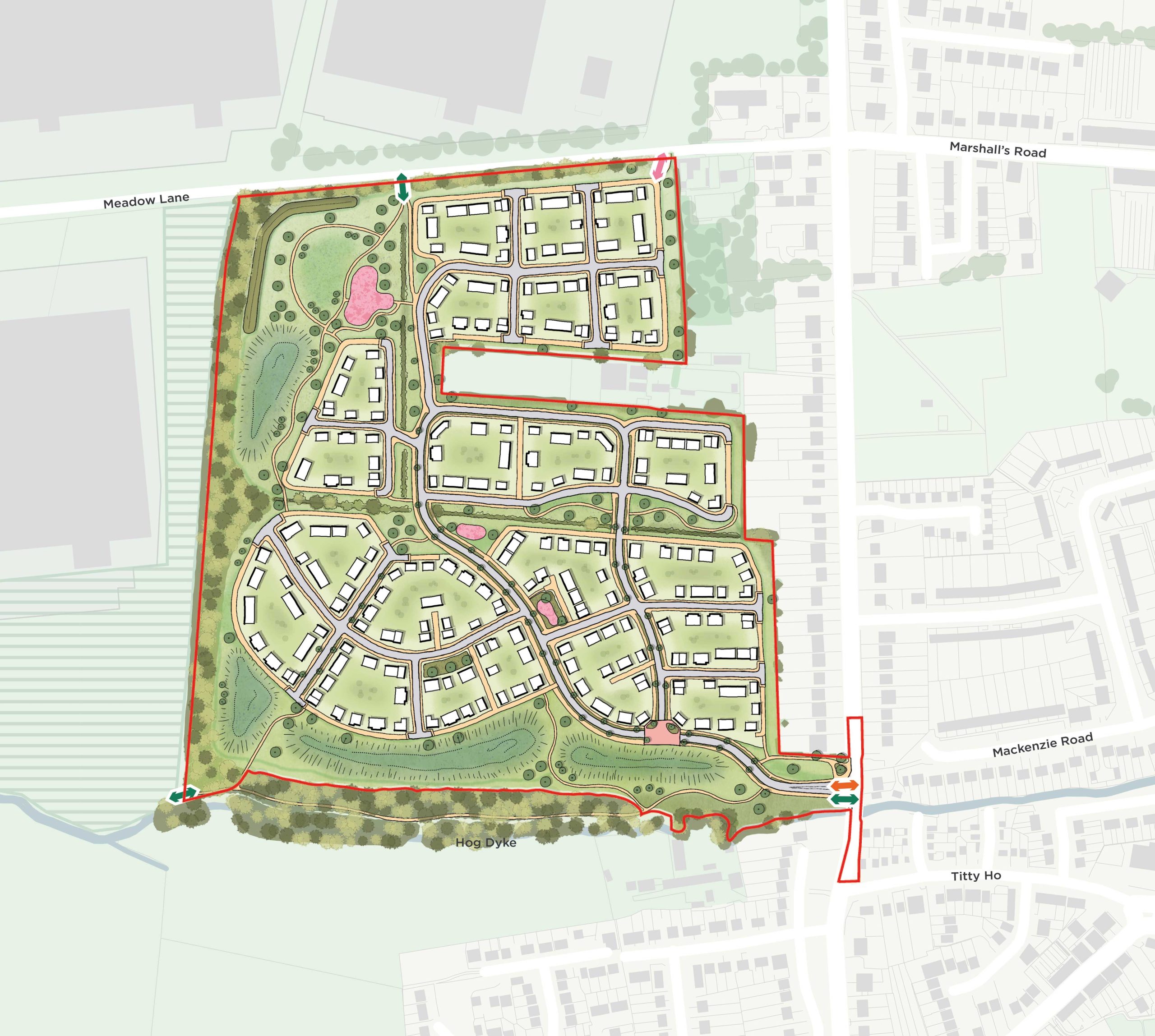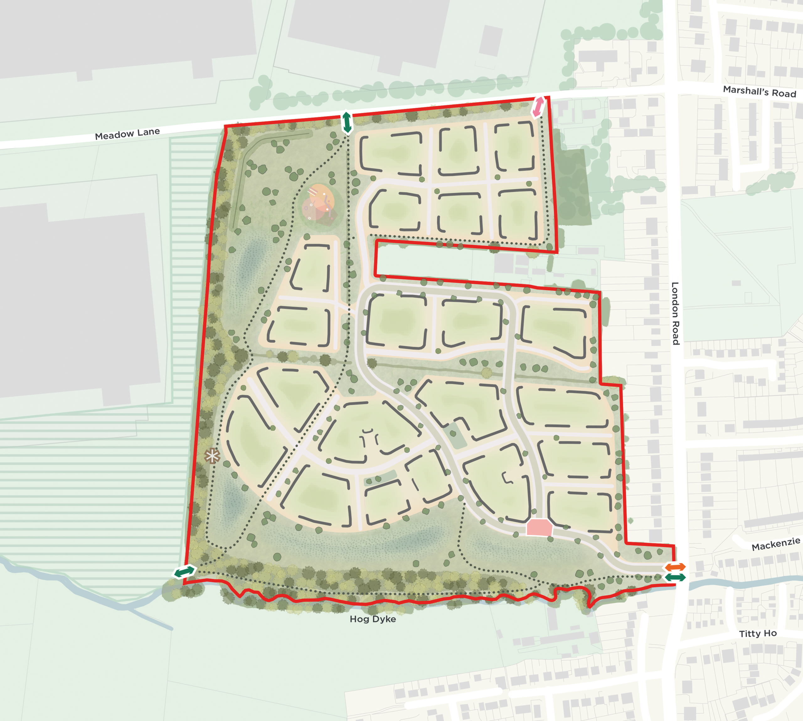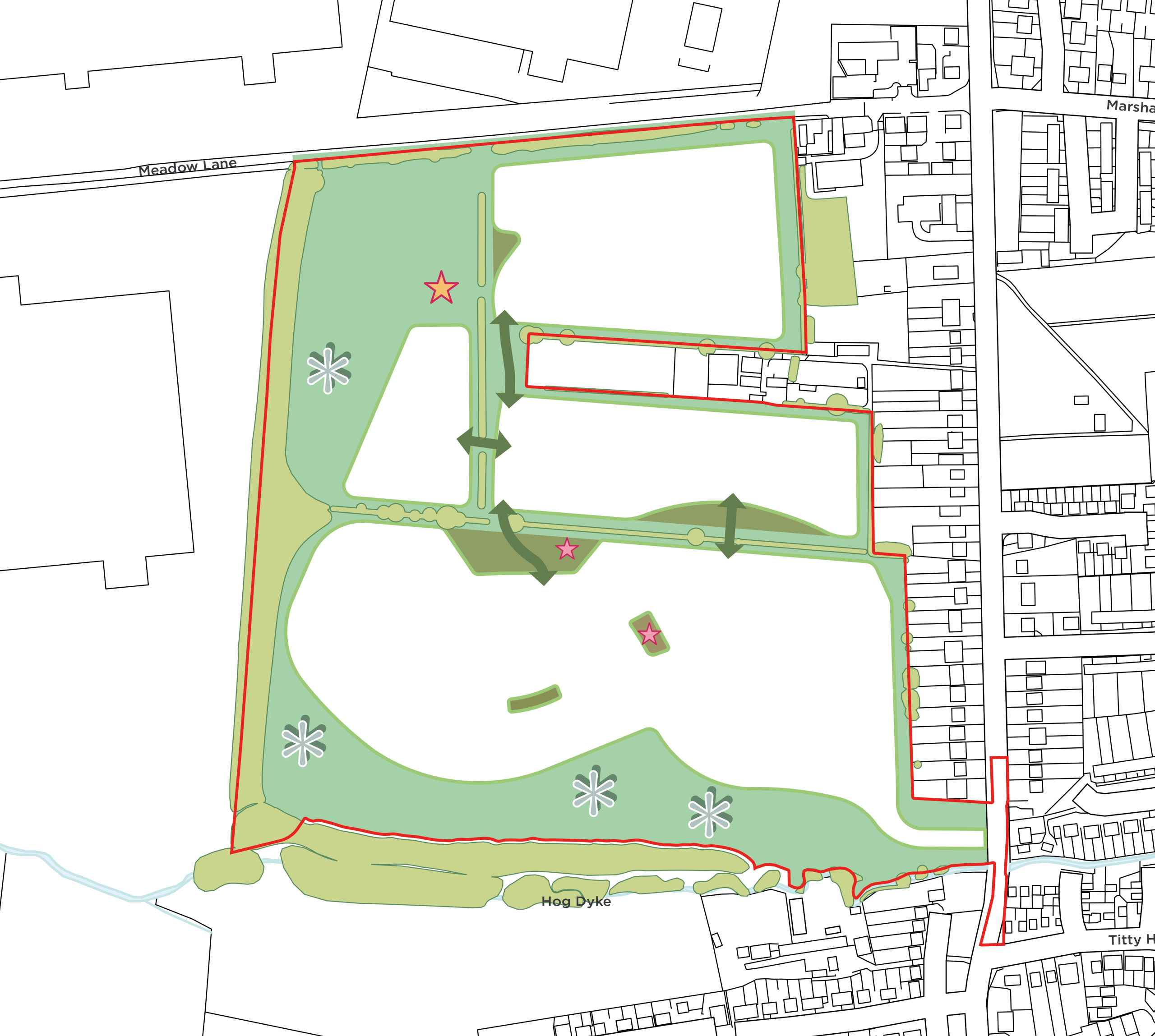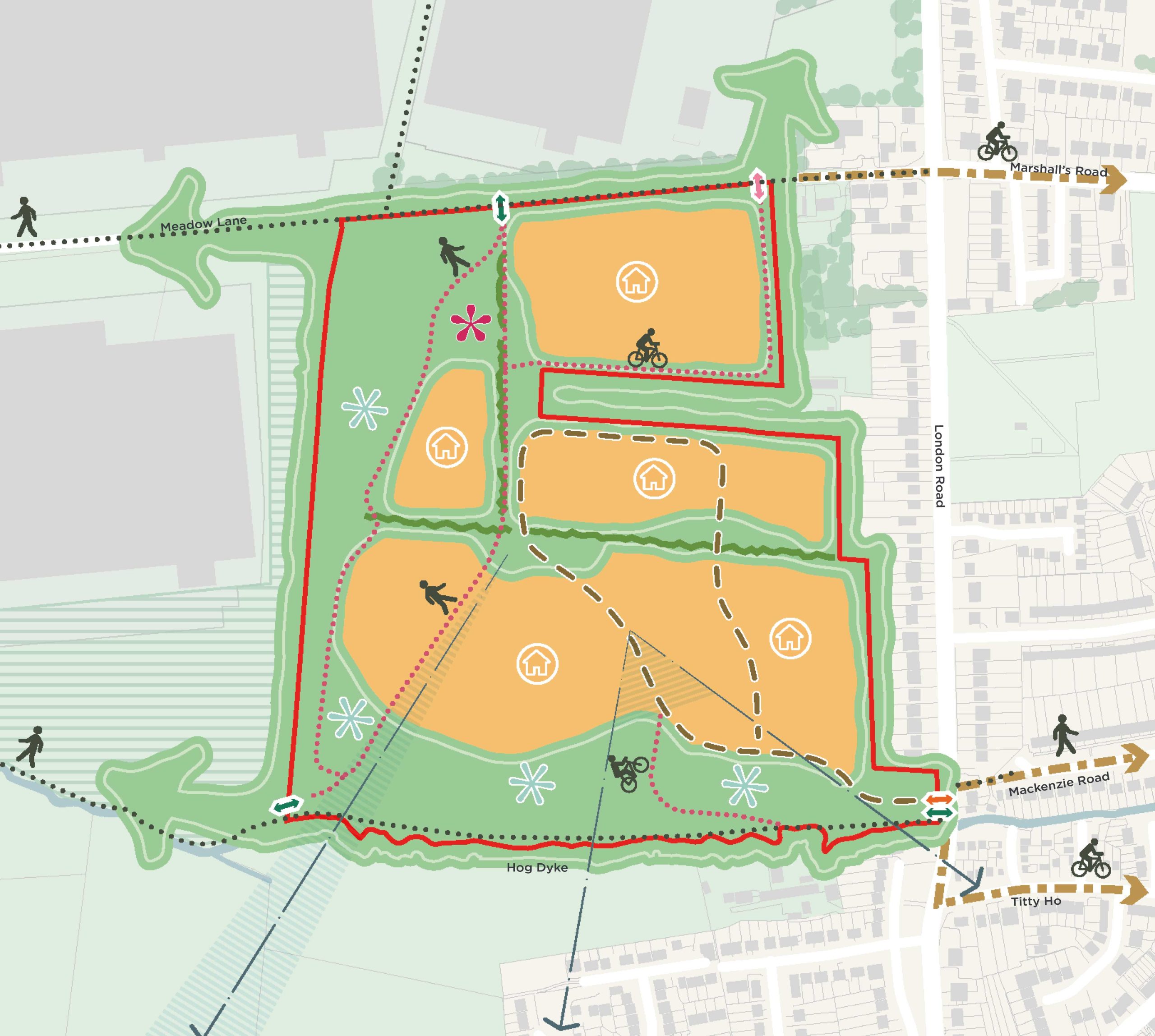 - Pedestrian and cycle access to Meadow Lane and connections to the Public Right of Way and neighbouring industrial estate;